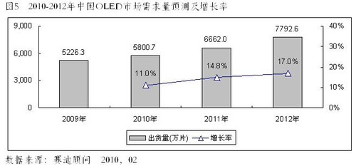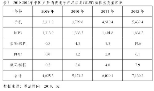 2010年4月13日,中國(guó)權(quán)威ICT研究與管理咨詢機(jī)構(gòu)賽迪顧問股份有限公司在“2010中國(guó)消費(fèi)電子市場(chǎng)年會(huì)”上發(fā)布《2009-2010年中國(guó)OLED產(chǎn)業(yè)發(fā)展研究年度報(bào)告》顯示:隨著手機(jī)和MP3/MP4等應(yīng)用產(chǎn)品需求的推動(dòng),OLED顯示屏市場(chǎng)自2003年開始快速成長(zhǎng),到2009年,全球OLED出貨量達(dá)到8780萬(wàn)片,由于受到全球終端產(chǎn)品有所減緩的影響,特別是手機(jī)和MP3市場(chǎng)出貨量的下滑,加上PMOLED全球產(chǎn)量明顯降低,但AMOLED在得到面板廠商大力推動(dòng)下,特別是像諾基亞、三星、索愛等終端廠商,均在2009年推出一系列采用AMOLED屏幕的手機(jī),在應(yīng)用市場(chǎng)的推動(dòng)下,AMOLED有了較大的增長(zhǎng),不過OLED總體仍有所下滑。伴隨著AMOLED出貨量的增長(zhǎng)和市場(chǎng)比例的提升,OLED整體產(chǎn)值有明顯的增長(zhǎng),2009年產(chǎn)值達(dá)到9.05億美元,較2008年成長(zhǎng)31.2%,出貨量在下滑的同時(shí),而出貨額保持增長(zhǎng),AMOLED貢獻(xiàn)極為明顯。