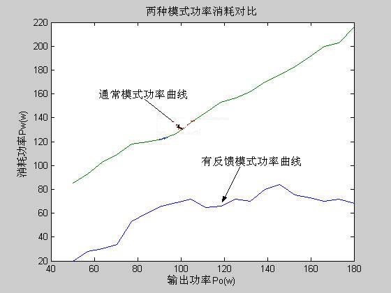 結(jié)果分析:在通常工作模式情況下,曲線的波動(dòng)是由于電能轉(zhuǎn)換器的轉(zhuǎn)換效率影響造成的,由前面原理分析可知消耗功率為Pi=Po+Pw,如果轉(zhuǎn)換效率為,則Pi=Po/η,轉(zhuǎn)換效率η通常隨著輸出功率的變化有一定的波動(dòng),所以曲線的波動(dòng)符合理論分析;在有反饋的工作模式情況下,由前面原理分析部分得系統(tǒng)的消耗功率為Pi=Pw+Pwf,分別設(shè)轉(zhuǎn)換器1的轉(zhuǎn)換效率為η1,反饋部分的轉(zhuǎn)換效率為η2,則系統(tǒng)的消耗功率為: