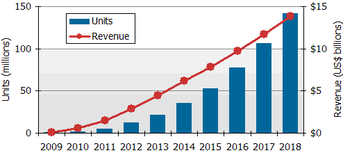 - 預(yù)估到2018年將大幅成長(zhǎng)到1億4千200萬(wàn)臺(tái),年產(chǎn)值達(dá)139億美元