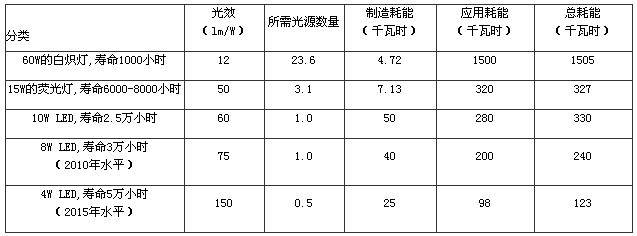 2.表中每個(gè)照明燈具提供600流明以上的光輸出,所需光源的數(shù)量、耗能統(tǒng)計(jì)均按工作25000小時(shí)計(jì)算。