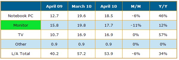根據(jù)DisplaySearch最新關(guān)于4月份大尺寸TFT LCD出貨量報告指出,4月份大尺寸面板出貨量達5千3百90萬片,較3月份下滑6%;出貨金額為71億美元,與上月相比下滑4%。不過相比較2009年4月份出貨情況,今年4月出貨量較去年增加34%,出貨金額增加達72%之多。