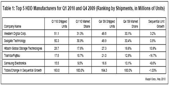 據(jù)iSuppli公司,西部數(shù)據(jù)在2010年第一季度硬盤出貨量最多,季度出貨量首次超過(guò)希捷,結(jié)束了長(zhǎng)期屈居第二的局面。
