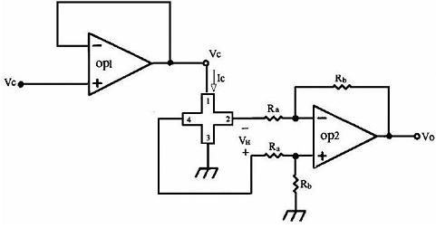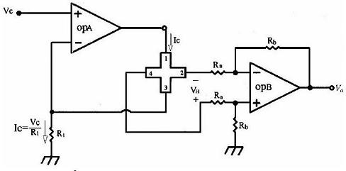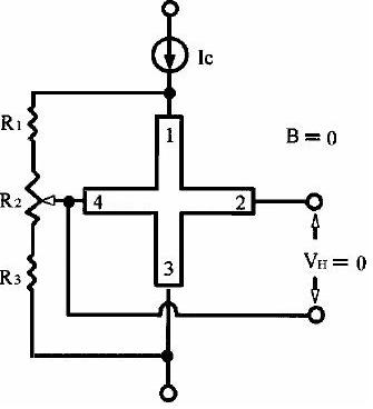 圖2系表示3~5端子之霍爾組件的使用方法,在三端子霍爾元件之輸出可以產(chǎn)生輸入端子電壓之大致一半與輸出信號(hào)電壓之和的電壓,而在四端子及五端子霍爾組件中,在原理上雖然可以免除輸入端子電壓的影響,但實(shí)際上即使在無(wú)磁場(chǎng)時(shí),也有起因于組件形狀之不平衡等因素之不平衡電壓存在。