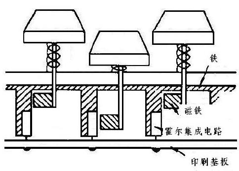 霍爾集成電路通常使用于前述磁電變換組件的項(xiàng)所述的(A-1)、(A-2)范圍的用途,在這些用途的中,特別像開(kāi)關(guān)那樣,以磁氣為媒介將位置的變化、速度、回轉(zhuǎn)等的物理量變換為電氣量時(shí),使用起來(lái)非常簡(jiǎn)單。使用霍爾集成電路的開(kāi)關(guān)系如圖2-21所示,這種開(kāi)關(guān)具有:(1)無(wú)震動(dòng)(Chattering),(2)不生雜音,(3)使用壽命長(zhǎng),可靠度高,(4)響應(yīng)速度快等特征,已經(jīng)實(shí)際被使用作為高級(jí)的鍵盤用開(kāi)關(guān)。