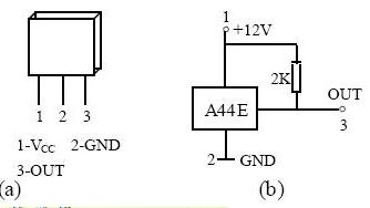 圖11是A44E集成霍耳開(kāi)關(guān),A44E集成霍耳開(kāi)關(guān)由穩(wěn)壓器A、霍耳電勢(shì)發(fā)生器(即硅霍耳片)(mT)、差分放大器C、施密特觸發(fā)器D和OC門輸出E五個(gè)基本部分組成,如圖12(a)所示。(1)、(2)、(3)代表集成霍耳開(kāi)關(guān)的三個(gè)引出端點(diǎn)。在輸入端輸入電壓VCC,經(jīng)穩(wěn)壓器穩(wěn)壓后加在霍耳電勢(shì)發(fā)生器的兩端,根據(jù)霍耳效應(yīng)原理,當(dāng)霍耳片處在磁場(chǎng)中時(shí),在垂直于磁場(chǎng)的方向通以電流,則與這二者相垂直的方向上將會(huì)產(chǎn)生霍耳電勢(shì)差HV輸出,該HV信號(hào)經(jīng)放大器放大后送至施密特觸發(fā)器整形,使其成為方波輸送到OC門輸出。