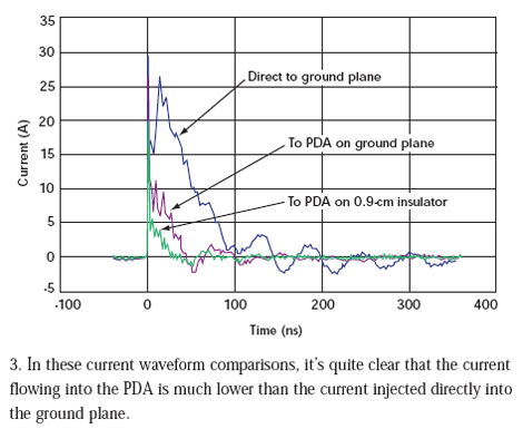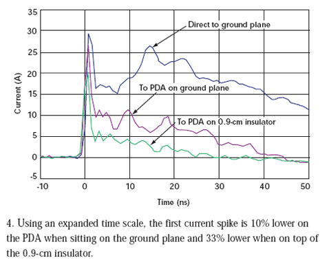 但是,我們見到的電流減小前后并不一致。當PDA直接放在接地板上時,初始電流尖峰降低了10%。當PDA放在0.9cm絕緣層上時,初始電流尖峰減低33%(圖4)。在20ns點,直接放在接地板上的PDA受到的沖擊要小69%,而位于絕緣層上的PDA受到的沖擊要小93%。電流減少是在沖擊狀態(tài)下給PDA充電的結果。在每次沖擊測試過程結束后,我們必須將PDA接地使它回到未充電狀態(tài)才能進行下次測量。