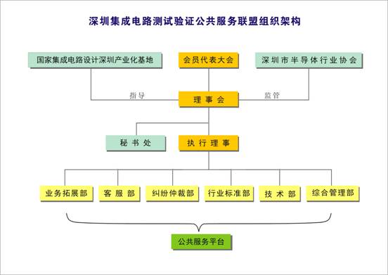 如上圖所示,會員代表大會由IC設計公司,封裝測試廠,設備廠商,高校,研究所和電子制造工廠代表組成,是深圳集成電路測試驗證公共服務聯(lián)盟的最高權力機構,下設理事會,理事會是聯(lián)盟管理的智囊團,各種規(guī)章制度的起草者和重大事務的決策者,其下又設執(zhí)行理事和秘書處,執(zhí)行理事負責日常事務的實際運行,是公共服務聯(lián)盟的操作單位,秘書處主要負責會員代表大會的召開以及日常會員事宜的組織,執(zhí)行理事又下設業(yè)務拓展部、客服部、糾紛仲裁部、行業(yè)標準部、技術部和綜合管理部。