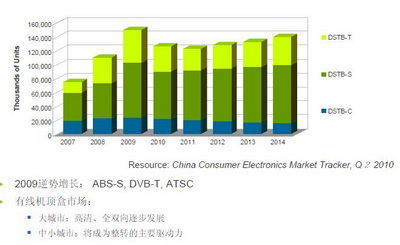 STB 2009年逆勢(shì)增長(zhǎng)。大城市發(fā)展方向是高清和雙向機(jī)頂盒;中小城市是STB的成長(zhǎng)主力。