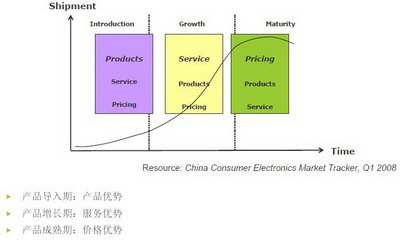 對(duì)原廠(chǎng)來(lái)說(shuō),市場(chǎng)開(kāi)發(fā)策略會(huì)隨著產(chǎn)品的不同生命周期而發(fā)生變化。在產(chǎn)品導(dǎo)入期,產(chǎn)品的優(yōu)勢(shì)最為突出,此時(shí)穩(wěn)定產(chǎn)品性能和表現(xiàn)最重要,在產(chǎn)品增長(zhǎng)期,競(jìng)爭(zhēng)漸多,客戶(hù)的要求也開(kāi)始提高,產(chǎn)品本身的優(yōu)勢(shì)可能最多3月甚至1個(gè)月就被競(jìng)爭(zhēng)對(duì)手追趕或超過(guò)。在產(chǎn)品增長(zhǎng)期末端和產(chǎn)品成熟期,市場(chǎng)差異化的空間已經(jīng)不大,上下游趨于集中,此時(shí)原廠(chǎng)經(jīng)過(guò)激烈競(jìng)爭(zhēng)后已經(jīng)只剩幾家寡頭,市場(chǎng)進(jìn)入拼價(jià)格的階段,這個(gè)時(shí)候,價(jià)格決定一切,原廠(chǎng)開(kāi)始突出價(jià)格優(yōu)勢(shì)。