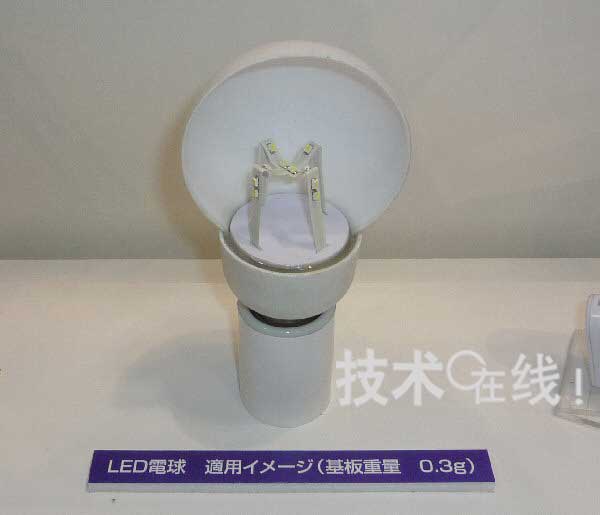 作為應(yīng)用立體布線的例子,Mectron還展出了LED燈泡的試制品。通過在立體底板上封裝朝向多個方向的LED模塊,可以擴(kuò)大光照射范圍。如果在布線層之外再加上散熱用厚銅箔,則LED模塊散熱也會變得很容易。