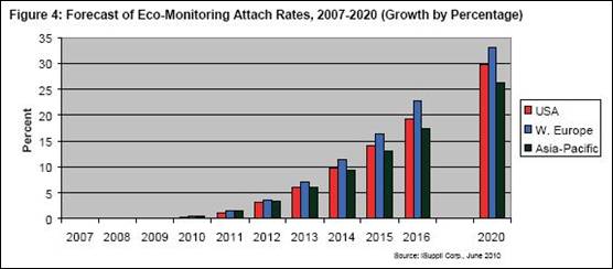 上述每類應用的汽車配售率預計都會增長,2010-2013年增長比較緩慢,隨后從2014年開始基本以兩位數(shù)的速度增長,直到2020年末。iSuppli公司的圖表顯示,節(jié)能監(jiān)測和節(jié)能建議近期將大幅增長,而由于復雜性和需要與其它汽車系統(tǒng)整合,節(jié)能動力總成的布署比較緩慢。但到2020年,美國和西歐的節(jié)能動力總成應用將達到35%的配售率,接近節(jié)能監(jiān)測和節(jié)能建議系統(tǒng)的水平。