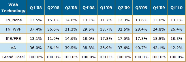 根據(jù)最新發(fā)布的 DisplaySearch Quarterly Wide Viewing Angle Technology Report, (DisplaySearch季度廣視角技術(shù)出貨報(bào)告) , VA(Vertical Alignment)型廣視角技術(shù)的面板出貨在所有LCD視角技術(shù)的出貨中取得領(lǐng)先,以出貨面積計(jì)算, VA型出貨占了2010年第一季全球所有面板出貨的43.5%(如以下附表所示)。而在各種不同的視角技術(shù)當(dāng)中,VA(Vertical Alignment)型廣視角技術(shù)的面板出貨從2008年第一季的36%持續(xù)成長到2010年第一季的43.5%,目前在面板廠的布局上,LG Display, IPS Alpha 與BOE采取了 IPS (In Plane Switching)與FFS(Fringe-field switching)的技術(shù),其余LCD TV面板生產(chǎn)廠商在32寸及以上的LCD TV面板采用了VA(Vertical Alignment)型廣視角技術(shù)。