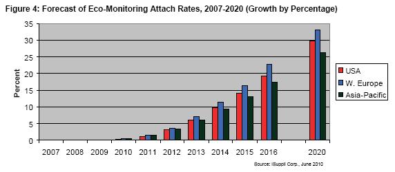 上述每類應用的汽車配售率預計都會增長,2010-2013年增長比較緩慢,隨后從2014年開始基本以兩位數的速度增長,直到2020年末。iSuppli公司的圖表顯示,節(jié)能監(jiān)測和節(jié)能建議近期將大幅增長,而由于復雜性和需要與其它汽車系統(tǒng)整合,節(jié)能動力總成的布署比較緩慢。但到2020年,美國和西歐的節(jié)能動力總成應用將達到35%的配售率,接近節(jié)能監(jiān)測和節(jié)能建議系統(tǒng)的水平。