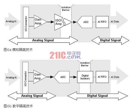 現(xiàn)今,許多商業(yè)現(xiàn)成可用(COTS)組件都含有上述隔離實(shí)現(xiàn)技術(shù)之一。對于模擬I/O通道,您可以在模數(shù)轉(zhuǎn)換器(ADC)完成信號的量化處理之前(模擬隔離)或之后(數(shù)字隔離)在設(shè)備的模擬部分實(shí)現(xiàn)隔離功能。根據(jù)您的隔離實(shí)現(xiàn)在電路中位置的不同,您需要依據(jù)其中的一種技術(shù)來設(shè)計(jì)不同的電路。您可以基于您的數(shù)據(jù)采集系統(tǒng)性能、成本和物理需求,選擇模擬或數(shù)字隔離技術(shù)。圖6a和6b展示了實(shí)現(xiàn)隔離功能的不同階段。