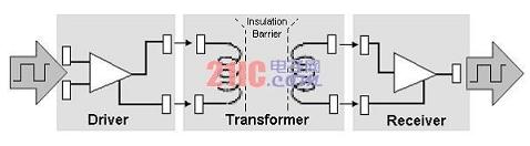 iCoupler技術(shù)基于小尺寸的、芯片大小的變壓器。一個iCoupler由三個主要部分組成——一個發(fā)射器、變壓器和一個接收器。發(fā)射器電路利用邊緣觸發(fā)器編碼,并將數(shù)字線路上的上升沿和下降沿轉(zhuǎn)換為1ns的脈沖。這些脈沖利用變壓器跨隔離層傳輸,并在另一側(cè)通過接收器電路解碼,如圖11所示。這些變壓器的小尺寸(約為1毫米的十分之三大小)使得它們幾乎不受外部磁噪聲干擾。iCoupler設(shè)備還可以通過在每個集成電路(IC)上集成高達(dá)四路隔離式通道,降低測量硬件的成本,而且,與光耦合器相比,它們所需的外部組件更少。