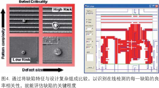 為了提高監(jiān)測和識(shí)別關(guān)鍵缺陷的效率,必須采用新方法。依賴簡單的缺陷過濾和基于大小的缺陷次序是不夠的。為了取得最佳的檢測和鑒評(píng)預(yù)算,必須對(duì)檢測設(shè)置與鑒評(píng)策略二者使用新的知識(shí)信息。從設(shè)計(jì)和模擬得到的關(guān)鍵區(qū)域和熱點(diǎn)這樣一些知識(shí)信息可以插入檢測方略中,優(yōu)化可用的檢測容量。在完成檢測過程中和完成后,基于多重檢測結(jié)果的缺陷過濾和分類使用戶能快速識(shí)別新缺陷,有效地量化已知的缺陷類型。利用設(shè)計(jì)空間中缺陷鄰近位置的信息(此處,設(shè)計(jì)的復(fù)雜組成是了解的),可以較好地評(píng)估每一缺陷的良率相關(guān)性,提供缺陷的排序(圖4)。