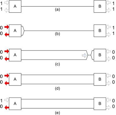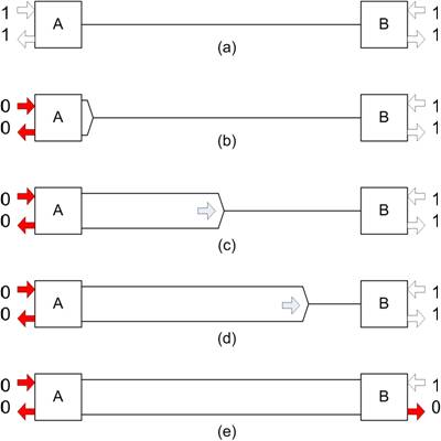 我們的下一種情況(圖2)假設(shè),節(jié)點A再次發(fā)起一條消息,但是節(jié)點B在稍后發(fā)起的一條消息具有更高的優(yōu)先級。如前所述,這種情況以兩個節(jié)點均處在非占用模式作為開始,如(2a所示,隨后節(jié)點A變?yōu)檎加茫ㄈ纾?b)所示)發(fā)起一條消息。該占用差動電壓再次沿線纜傳輸。在信號到達(dá)B處的收發(fā)器以前,該節(jié)點剛好利用如(2c)所示占用位發(fā)起一條消息。這時,兩個節(jié)點都正傳輸一個占用位,并且兩個節(jié)點都正接收一個占用位(如(2d)所示),然后兩個節(jié)點都沒意識到另一個節(jié)點也已啟用。由于在我們的假設(shè)情況中,節(jié)點A具有比節(jié)點B更低的優(yōu)先級,因此有時節(jié)點A會通過將其TXD設(shè)置為0(如(2e)所示)來發(fā)出一個非占用位。但是,由于節(jié)點B的作用,RXD會感應(yīng)到總線仍然處在占用狀態(tài)下。