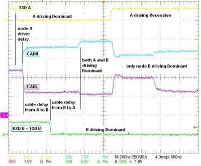 CAN標(biāo)準(zhǔn)規(guī)定,線纜為5ns每米傳輸延遲,1Mbps信號速率時最大線纜長度為40米。位時間為1000ns時,最遲采樣點(由PROP_SEG設(shè)定)約為850ns。線纜本身具有200ns的單向延遲(即400ns雙向延遲),從而使收發(fā)器和相關(guān)電路的總延遲只剩約450ns。