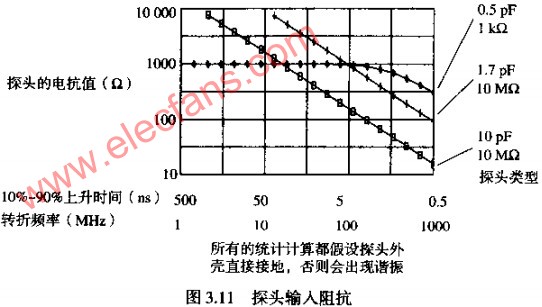 參見圖3.11,在我們關注的上升時間范圍內(nèi),探頭的并聯(lián)電容越高,阻抗會越低。在高頻時,只有并聯(lián)電容比較重要。