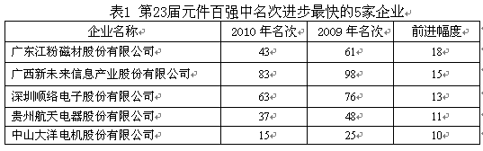 金融危機(jī)造成的企業(yè)經(jīng)營(yíng)上的波動(dòng)都反饋到了第22屆、23屆元件百強(qiáng)的榜單上。在近兩屆的榜單之中,均有20多家企業(yè)的名次出現(xiàn)了10位以上(含10位)的較大波動(dòng),去年23家,今年21家。據(jù)估計(jì),如果國際國內(nèi)的經(jīng)濟(jì)形勢(shì)能保持穩(wěn)定,在未來一兩年內(nèi),元件百強(qiáng)榜單中,名次出現(xiàn)大起大落的企業(yè)數(shù)量將會(huì)減少。