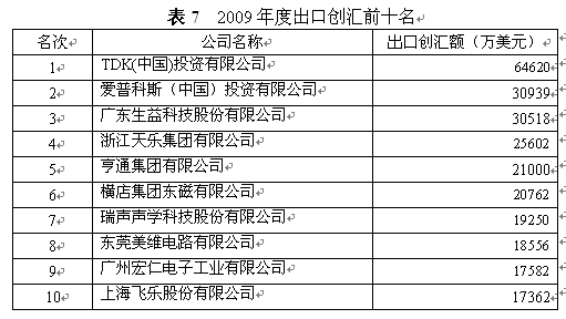 對(duì)于中國電子元件行業(yè)的外貿(mào)出口來說,2009年是一個(gè)從谷底緩慢爬升的過程。本屆元件百強(qiáng)中出口創(chuàng)匯總額為52.48億美元,同比下降10.38%,占銷售收入總額的28.81%,與上屆元件百強(qiáng)的出口總額相比,下降了9.83%。由于金融危機(jī)導(dǎo)致了外需萎縮,而且我國刺激內(nèi)需的各項(xiàng)政策效果明顯,一些元件百強(qiáng)企業(yè)開始更多地關(guān)注國內(nèi)市場(chǎng),所以本屆元件百強(qiáng)的出口創(chuàng)匯額雖然下滑,但整體銷售收入仍然獲得增長(zhǎng)。