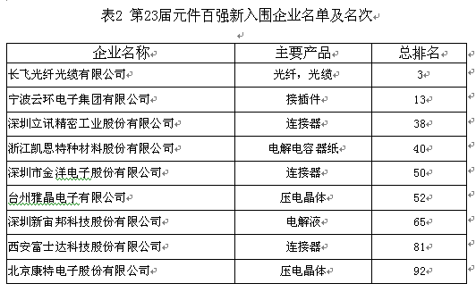 本屆元件百強(qiáng)中共有9家新企業(yè),其中,我國光纖光纜制造業(yè)的龍頭企業(yè)長(zhǎng)飛光纖光纜有限公司表現(xiàn)最為突出,一舉斬獲本屆元件百強(qiáng)的季軍寶座。而寧波云環(huán)電子集團(tuán)有限公司、深圳立訊精密工業(yè)股份有限公司、浙江凱恩特種材料股份有限公司、深圳市金洋電子股份有限公司等新入圍企業(yè)均表現(xiàn)不俗。