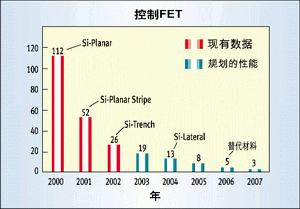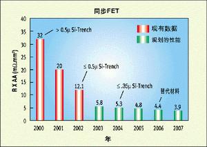 圖2所示的是同步或稱低端(low-side)FET的品質(zhì)因數(shù)。在這里,實際上是傳導損耗主宰了處在導通電阻時域的品質(zhì)因數(shù)。僅在過去的兩年中,通過將1至2微米溝道技術(shù)升級為深亞微米水平,就使品質(zhì)因數(shù)提高了約3倍,今后還有更多的改進余地。