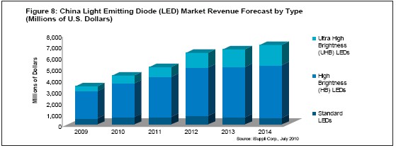 另外,憑借政府的支持和LED日益進(jìn)入液晶電視及普通照明等新的應(yīng)用領(lǐng)域,iSuppli公司預(yù)測,2014年中國LED營業(yè)收入將達(dá)到71億美元,而2009年是34億美元,其間的復(fù)合年度增長率為12.8%。超高亮度(UHB)LED的增長速度更快,到2014年銷售額將從2010年的6.86億美元上升到18億美元,復(fù)合年度增長率為26.9%。