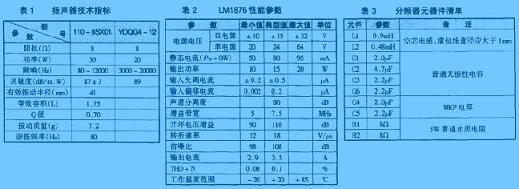圖9是該音箱分頻器電路圖,分頻點選在3kHz。由于揚聲器是一個感性負(fù)載,當(dāng)通過信號頻率不同時,其阻抗變化很大,故在分頻器中加入了由R1、C3、R2、C6組成的阻抗校正網(wǎng)絡(luò),使分頻器的負(fù)載阻抗近似為恒定值。分頻器所用元器件的參數(shù)如表3所示。