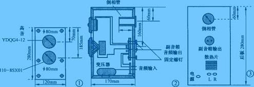 功放電路安裝在右聲道音箱中,因此左右兩個音箱的后面板布局有較大的差異。倒相管長度以及主音箱側(cè)面視圖如圖2所示。主音箱背面視圖如圖3所示。