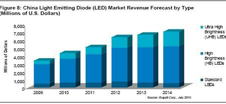 另外,憑借政府的支持和LED日益進入液晶電視及普通照明等新的應(yīng)用領(lǐng)域,iSuppli公司預(yù)測,2014年中國LED營業(yè)收入將達到71億美元,而2009年是34億美元,其間的復(fù)合年度增長率為12.8%。超高亮度(UHB)LED的增長速度更快,到2014年銷售額將從2010年的6.86億美元上升到18億美元,復(fù)合年度增長率為26.9%。
