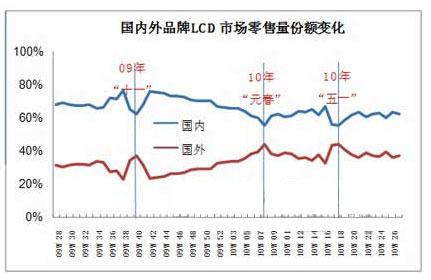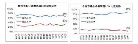 尤其在節(jié)慶期間,外資品牌大規(guī)模的降價促銷,使得國內(nèi)電視品牌城市市場的規(guī)模及利潤大幅縮減。2010年五一前,外資品牌重點在32英寸的2499/2999元兩個定價點,逐步擴張城市中低端市場。從五一開始,外資品牌將策略延伸至大尺寸,40英寸平板電視價格低至4499元,將內(nèi)外資品牌電視價差降至500元以內(nèi),對國產(chǎn)品牌產(chǎn)生較大沖擊。不過,在農(nóng)村市場,國內(nèi)電視企業(yè)面對家電下鄉(xiāng)政策帶來的巨大機會,可憑借一貫的本土優(yōu)勢全力彌補城市市場的份額損失,從而使其與外資電視品牌市場份額比例保持在7:3(見圖3)。