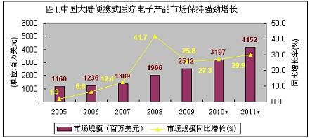 2005-2009年,中國大陸便攜式醫(yī)療電子產(chǎn)品市場呈現(xiàn)出加速增長勢態(tài),年復合增長率高達30.8%,幾乎沒有受到金融危機的影響。2009年市場總規(guī)模達到25.12億美元,增長速度達到25.8%占醫(yī)療電子產(chǎn)品總市場的53.2%。在便攜式醫(yī)療電子市場中,家用的占六成以上的份額,電子血壓計、便攜式血糖儀和電子助聽器占據(jù)了90%以上的銷售份額。由于目前市場處于普及的初級階段,中國人口基數(shù)大,國人健康意識的提升,整個便攜式醫(yī)療電子市場需要面對的是中國內(nèi)需市場,不存在市場飽和所謂的受金融危機影響。所以家用便攜式醫(yī)療電子產(chǎn)品市場前景非常好,便攜式、信息化、低功耗、低成本以及安全性是市場關注的熱點。展望未來,中國便攜式醫(yī)療電子市場前景非常誘人,在未來兩年,中國便攜式醫(yī)療電子產(chǎn)品市場規(guī)模年復合增長率可接近30%,2010年市場規(guī)模將接近32億美元,2011年會超過40億美元。(見下圖)。