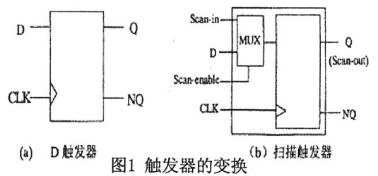 假設(shè)電路中的時序元件是由圖1(a)所示的D觸發(fā)器組成,寄存器變化法就是將此D觸發(fā)器轉(zhuǎn)化成圖1(b)所示的具有掃描功能的觸發(fā)器。從圖中可以看出掃描觸發(fā)器主要是在原觸發(fā)器的D輸入端增加了一個多路選擇器,通過掃描控制信號(Scan—enable)來選擇觸發(fā)器的輸入數(shù)據(jù)是正常工作時的輸入信號(D)還是測試掃描數(shù)據(jù)(Scan—in)。