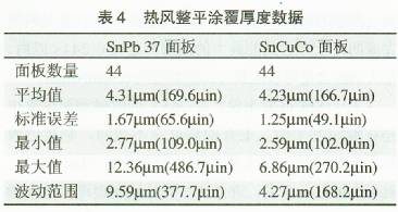 正如前文所談及的那樣,在實(shí)施PCB組件制造的時(shí)候,所采用熱風(fēng)整平工藝的比例從高達(dá)所有電路板中的80%減少到大約60%。隨著要求具有平坦一致的表面(共平面)的SMT技術(shù)穩(wěn)步發(fā)展,這種減少現(xiàn)象還會(huì)同步的發(fā)生。傳統(tǒng)的SnPb熱風(fēng)整平工藝能夠提供具有令人滿(mǎn)意共面性的SMT電路板?,F(xiàn)在關(guān)注的是無(wú)鉛化中熱風(fēng)整平會(huì)產(chǎn)生什么問(wèn)題,經(jīng)無(wú)鉛化熱風(fēng)整平的電路板會(huì)更好還是更壞,或者與經(jīng)SnPb熱風(fēng)整平工藝處理的PCB組件是否具有相同的共平面效果?美國(guó)MetallicRe—sourcesInc公司的技術(shù)人員為此開(kāi)始了一次又一次的試驗(yàn),結(jié)果表明SnCuCo比起傳統(tǒng)的SnPb共熔合金,會(huì)產(chǎn)生略簿一些、更趨共平面效果的涂覆。這些結(jié)果被反復(fù)地的進(jìn)行研究。表4顯示了從一臺(tái)水平放置的熱風(fēng)整平設(shè)備上實(shí)施這些試驗(yàn)的一些測(cè)試結(jié)果。