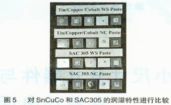 圖4顯示了SnCuCo合會(huì)的潤(rùn)濕特性。它與存采用了各種涂覆方式的電路板上的SAC305具有非常相似的效果。這也就說(shuō)明SnCuCo至少與SAC305一樣,在電路板潤(rùn)濕方面具有相同的性能。