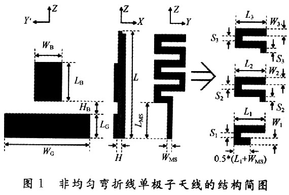 彎折線結(jié)構(gòu)在減小天線尺寸和改善天線帶寬特性方面,已經(jīng)成為現(xiàn)代天線設(shè)計(jì)的新熱點(diǎn)。為了改善彎折線天線的性能,研究者針對(duì)不同的應(yīng)用和特性要求,提出了多種改進(jìn)結(jié)構(gòu),其中主要有雙彎折線天線、折疊式彎折線天線、立體式彎折線天線、漸變式彎折線天線、行波彎折線天線和彎折線縫隙天線。