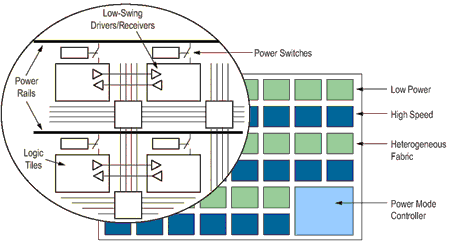 圖3所示為具有上述某些概念的FPGA架構,其可編程異構架構由高速度和低功耗兩個區(qū)組成。一個片上功耗模式控制器可管理各種降功耗模式,即深睡眠模式、懸掛模式和休眠模式。在架構內部,可以用專用的供電開關關掉每個邏輯塊的電源。通過布線架構的通信信號流經低擺幅驅動器和接收器,以降低互連功耗。