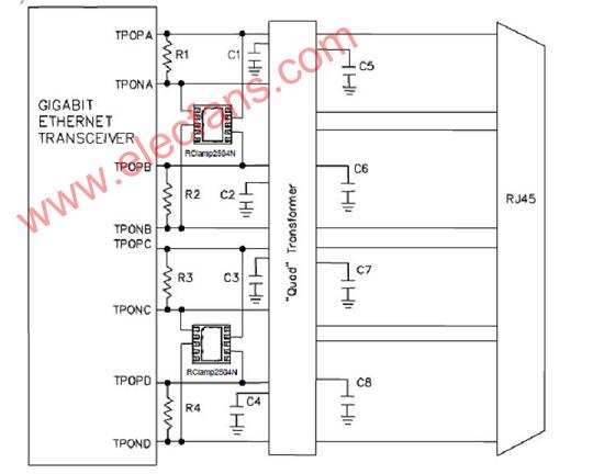 Semtech公司的RClamp2504N/3304N已被成功地應用在電腦的RJ45連接器里,它具有較低的鉗位電壓,電容和工作電壓,這樣可以保護一些敏感的物理層的芯片。該解決方案將非常好,成本低,加上好的RJ45連接器結(jié)構(gòu)和PCB設(shè)計給線對地保護。