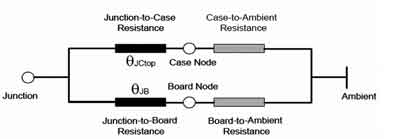 這樣就可以根據(jù)公式RJX=(TJ-TX)/Ploss求出結(jié)點到環(huán)境的熱阻RthJA(RthJA=RthJS+RthSA)。有關(guān)RthJA的計算,這里只介紹一種簡單的熱模型(Compactthermalmodel)2R模型,即Two-ResistorModel。其理論依據(jù)如圖4所示。