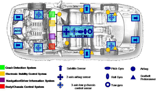 在汽車的主動與被動安全保護領(lǐng)域,市場趨勢主要包括以下幾個方面:首先,傳感器趨于整合,例如將ESP與安全氣囊放置在同一ECU之內(nèi);其次,傳感器的界面將趨于標(biāo)準化,其中包括數(shù)字界面,SPI、DSI以及PSI5。目前,市場上PSI5的采用率要高于DSI;第三,市場上對高性能陀螺儀的需求將逐漸增多,尤其是配有高級駕駛輔助系統(tǒng)如ACC的汽車;第四,中國和印度等國家已經(jīng)在司法層面上做出規(guī)定,要求所有汽車100%裝有安全氣囊; 第五、歐洲國家也頒布了有關(guān)行人保護的法規(guī),車載衛(wèi)星導(dǎo)航將成為主要趨勢,因此正面撞擊傳感器將成為主要的解決方案。