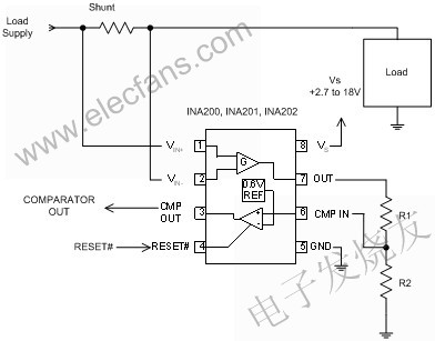 在許多應(yīng)用中,電流應(yīng)與某個(gè)設(shè)定值相比較。通常說來,進(jìn)行電流比較還需要電流分路監(jiān)控器、比較器和參考電壓。此外,理想的比較器輸出應(yīng)與大多數(shù)常見的邏輯電路很好地兼容。圖5給出了電流比較的例子。在本例中,將電流與采用TIINA200系列電流分路監(jiān)控器和比較器的簡(jiǎn)單單電壓結(jié)點(diǎn)進(jìn)行了比較。R1和R2形成分壓器,以根據(jù)INA200系列比較器的內(nèi)置0.6V電壓結(jié)點(diǎn)來設(shè)置電壓結(jié)點(diǎn)。(INA200系列的增益很有特點(diǎn):INA200的增益為20,INA201的增益為50,INA202的增益為100。)