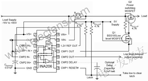 圖6在該雙電平電流比較電路中,低電平延遲輸出可對(duì)即將發(fā)生的過載發(fā)出警報(bào),支持鎖存功能的上限可將負(fù)載電源關(guān)閉。