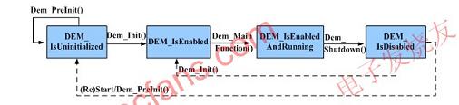 DCM模組遵循的標(biāo)準(zhǔn)與DCM相同,負(fù)責(zé)直接處理與DTC相關(guān)的服務(wù),如UDS中的0x19服務(wù)(響應(yīng)報(bào)文由DCM發(fā)送出去)。當(dāng)軟體構(gòu)件中的MonitorFunction檢測到故障或BSW模組檢測到故障時(shí),將通知DEM模組處理和儲存‘診斷事件’(由EventID進(jìn)行標(biāo)識)。如果故障確診,唿叫NVRAMManager(非揮發(fā)性記憶體管理器)提供的介面將其存取到非揮發(fā)性記憶體中,同時(shí)通知應(yīng)用層進(jìn)行故障指示。DEM的狀態(tài)圖如圖3所示: