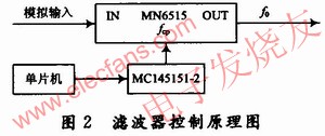 模擬器件的發(fā)展與集成為小型化提供了充分的條件,像松下公司的MN6515,僅為8腳,其帶通濾波器的中心頻率f0可由外加的時鐘頻率fcp控制,其比值fcp/f0約為15.7。只要改變fcp的值,帶通濾波器的中心頻率就會在O~32kHz范圍內(nèi)移動,非常方便,可采用圖2方式進(jìn)行控制。