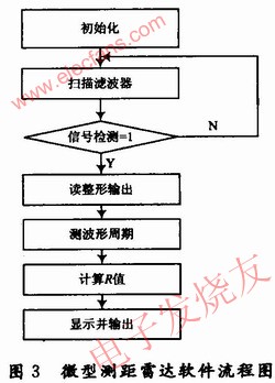 雷達(dá)工作時,單片機(jī)控制窄帶濾波器不斷的進(jìn)行掃描,當(dāng)某一個濾波器有信號時,由可重觸發(fā)單穩(wěn)態(tài)電路組成的信號檢測電路輸出由“0”變?yōu)?ldquo;1”,單片機(jī)根據(jù)輸出的窄帶濾波器獲得帶內(nèi)頻率,判斷出精度不太高的距離范圍,利用放大整形輸出進(jìn)行計(jì)數(shù)或測量脈沖的周期,獲得足夠精確的頻率值,即為準(zhǔn)確距離。根據(jù)公式計(jì)算出R和V送顯示器予以顯示,或通過RS232串口送上一級的計(jì)算機(jī)系統(tǒng)。