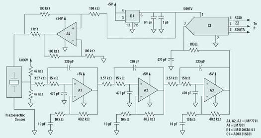 ADC121S021是一款設(shè)有串行外圍接口(SPI)的12位、200kSPS單端輸入轉(zhuǎn)換器。型號為LM4140ACM-4.1的另一款高精度電壓參考電路可為這款模擬/數(shù)字轉(zhuǎn)換器提供電壓參考,并為濾波放大器提供偏壓,并設(shè)置濾波器的偏置電壓為模擬/數(shù)字轉(zhuǎn)換器輸入電壓范圍的一半。傳感器的輸出屬于交流電信號,而中度的電平偏移可將信號轉(zhuǎn)移到模擬/數(shù)字轉(zhuǎn)換器輸入電壓范圍內(nèi)的中央位置。LM4140芯片也可為LM730132V通用放大器(即A4放大器)所輸出的壓控電流提供電壓參考。傳感器內(nèi)置的MOSFET可為壓電傳感電路提供緩沖。A4放大器負(fù)責(zé)輸出電流,以便驅(qū)動組成為共源級放大器的MOSFET,而有關(guān)晶體管則通過交流耦合與輸出終端裝置連接在一起。