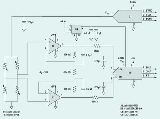上例電路的液壓傳感器屬于電阻性電橋,傳感器的輸出取決于電阻值的變動及驅(qū)動電阻的電壓,并與兩者有函數(shù)上的關(guān)系。圖3所示的傳感器具有0.2mV/V的敏感度。DAC081S101是一款8位的數(shù)字/模擬轉(zhuǎn)換器,可以改變驅(qū)動電橋的電壓,以便為液壓測量電路提供增益控制。例如,數(shù)字/模擬轉(zhuǎn)換器輸出若設(shè)定為4V,那么全標(biāo)度液壓便可達25.6PSI。若輸出電壓為1V,全標(biāo)度液壓便高達102PSI。