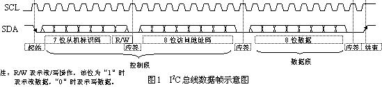 如圖1所示是常見的I2C總線上傳輸?shù)囊蛔止?jié)數(shù)據(jù)的數(shù)據(jù)幀,其總線形式是由數(shù)據(jù)線SDA和時(shí)鐘SCL構(gòu)成的雙線制串行總線,并接在總線上的電路模塊即可作為發(fā)送器(主機(jī))又可作為接收器(從機(jī))。幀數(shù)據(jù)中除了控制碼(包括從機(jī)標(biāo)識(shí)碼和訪問地址碼)與數(shù)據(jù)碼外還包括起始信號(hào)、結(jié)束信號(hào)和應(yīng)答信號(hào)[4]。