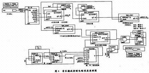 根據(jù)設(shè)計(jì)電路原理框圖,曲譜碼以分頻數(shù)編碼,音高信號(hào)分頻由一個(gè)可預(yù)置的模N計(jì)數(shù)器實(shí)現(xiàn)。分頻系數(shù)表和曲譜表都存儲(chǔ)在ROM中。若希望控制蜂鳴器的信號(hào)占空比為50%,分頻器的輸出信號(hào)采用二分頻電路實(shí)現(xiàn)占空比整形,但注意信號(hào)頻率被降低一半。電路原理框圖中M分頻器的作用是產(chǎn)生合適的時(shí)值計(jì)數(shù)脈沖頻率。電路的頂層原理圖如圖4所示。